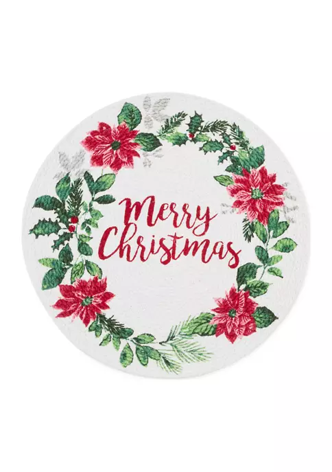 This round braided placemat from Arlee Home Fashions Inc.™ is printed with a ‘Merry Christmas’ greeting and bordered with poinsettia and holly berries on a white ground.