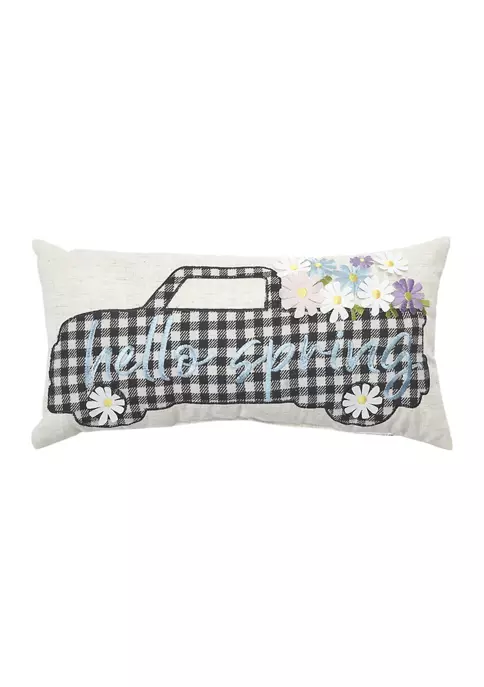 A gingham-patterned truck embellishment that reads “hello spring” characterizes this throw pillow from Arlee Home Fashions Inc.™.