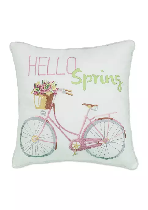 This pillow features a “hello spring!” novelty bicycle with a basket of flowers with appliqué and embroidery details.