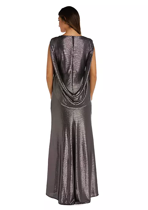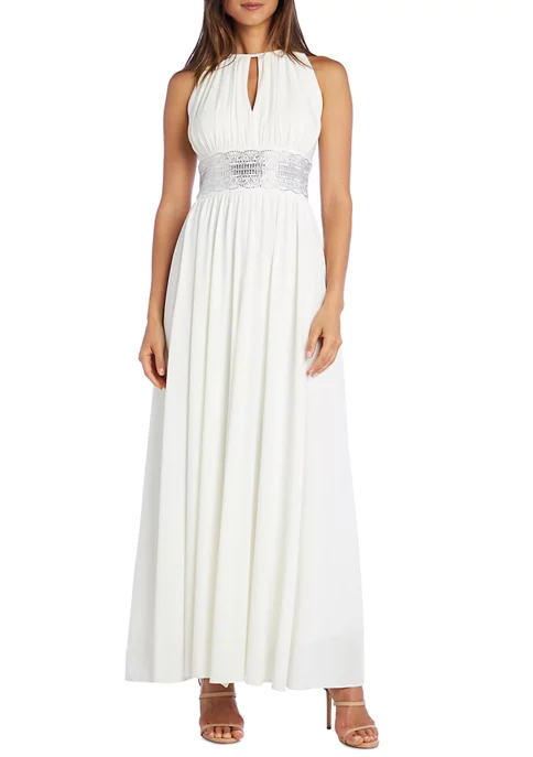 Boasting beaded accents at the waist, this long dress from R&M Richards is in a sleeveless design with a keyhole neck.